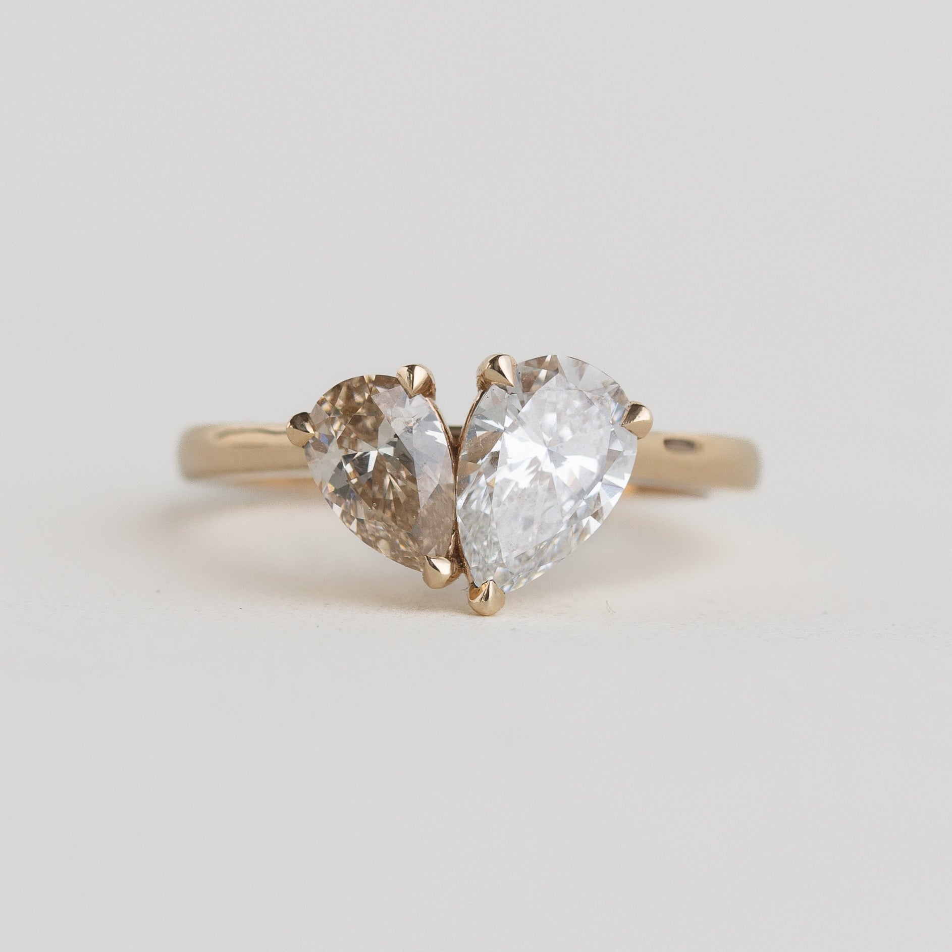 Two asymmetric sapphires are carefully set in a subtle heart shape. Fishtail prongs protect the tip of the pear-cut stones, and eagle claw prongs add an air of refinement to the design. The Chiara Ring is a versatile statement piece—whether worn alone or amongst your current ring stack. Pair it with our Zarah Band to match this pear-cut theme.