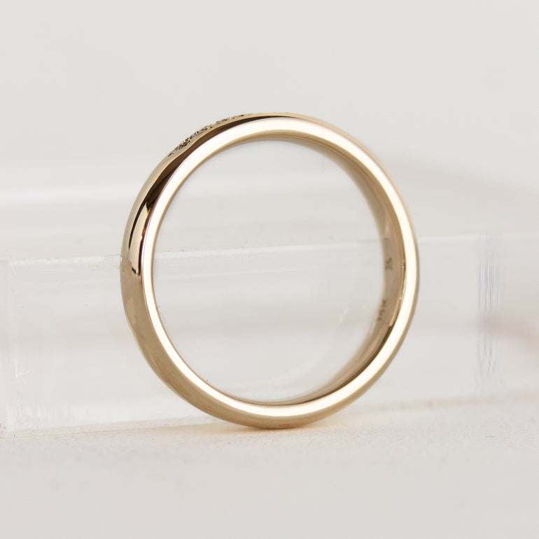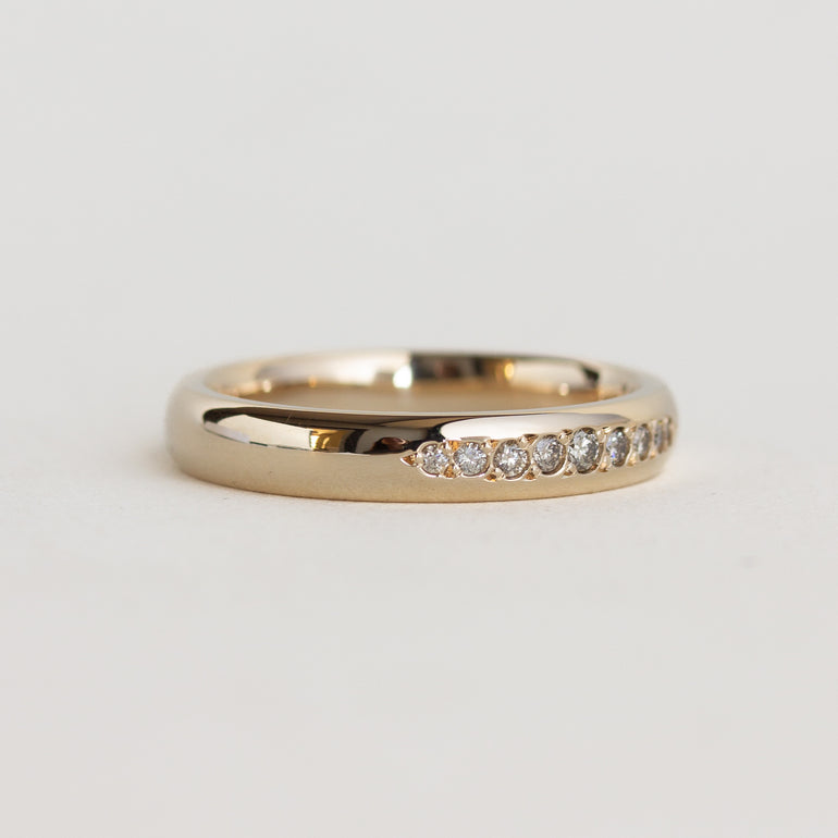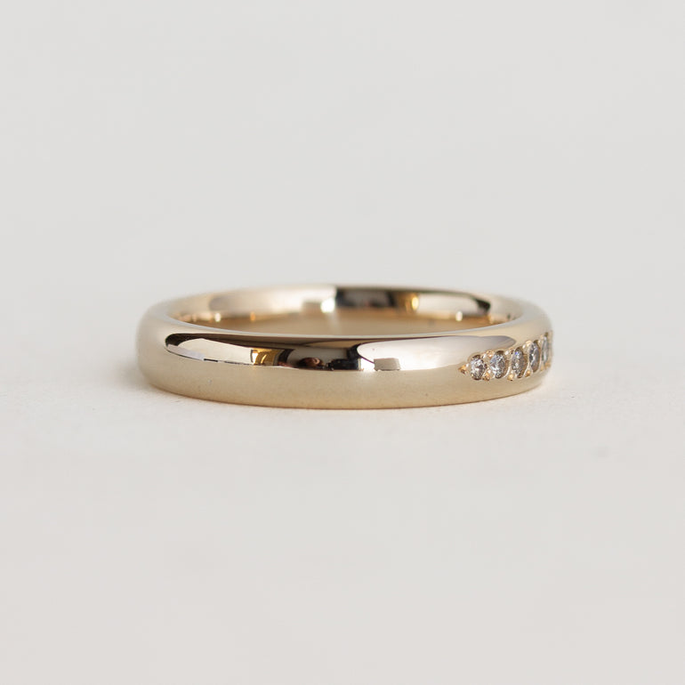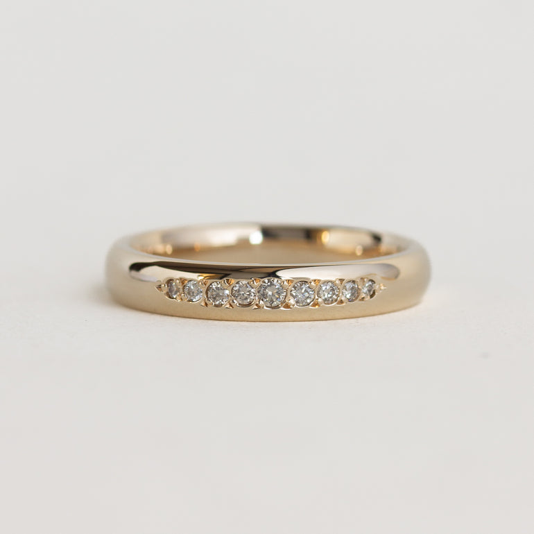 The Camille Band: a luxuriously weighted European-style wedding band set with a graduating array of bead-set round, brilliant-cut champagne natural diamonds.
