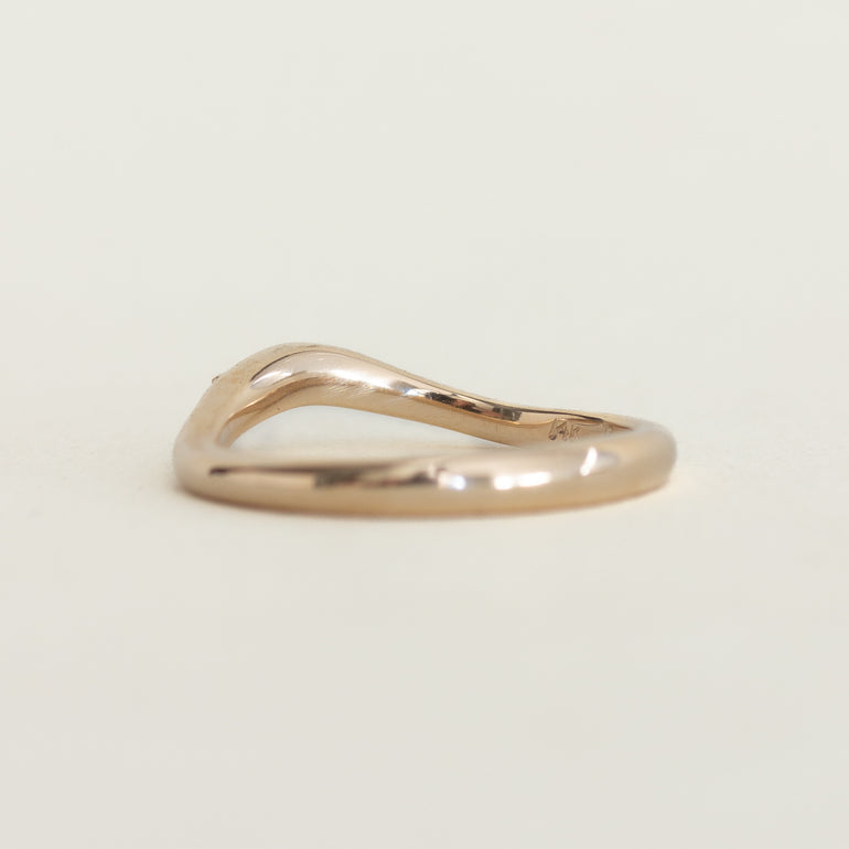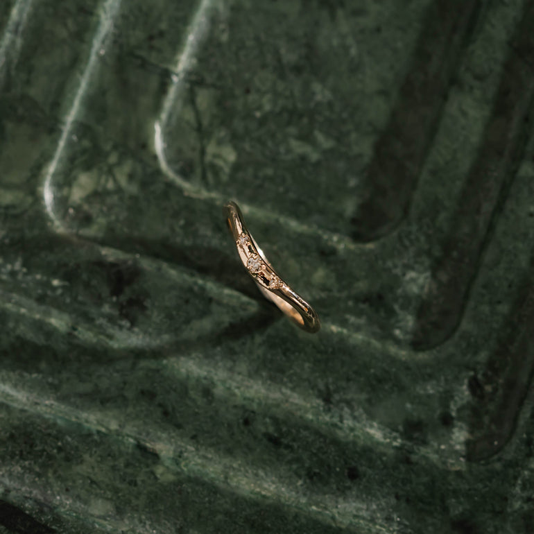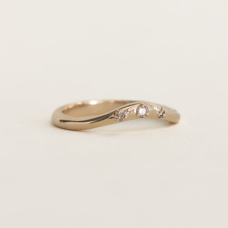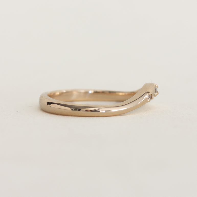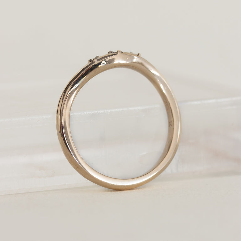 The Lena Band: a classic contour wedding band, design to flow around low-profile engagement ring designs. Three bead-set champagne diamonds contribute a tonal accent this otherwise simple band.