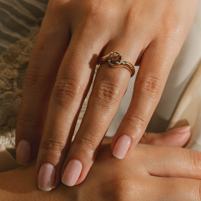 The Ottilie Ring: featuring a unique, natural chocolate zircon as its centrepiece, this domed bypass design is an excellent choice for those who value understated sophistication and practical wearability in their fine jewellery.