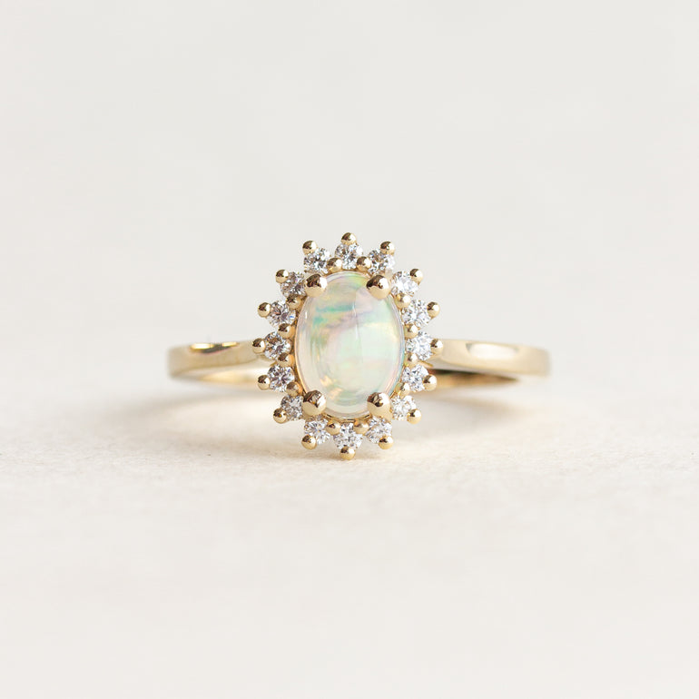 For the Parisian trendsetter—a flawless, classic blue sapphire stone set atop a 14K yellow gold band, surrounded by a halo of petite diamonds. The Josephine Ring is the sister of the Aurora Ring, and features a brilliant cut centre stone with a vintage inspired floral diamond halo to create a luxurious, fashion forward show stopper.