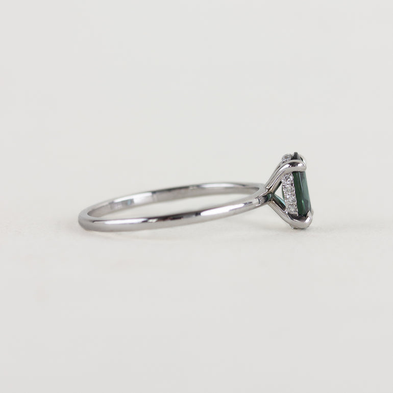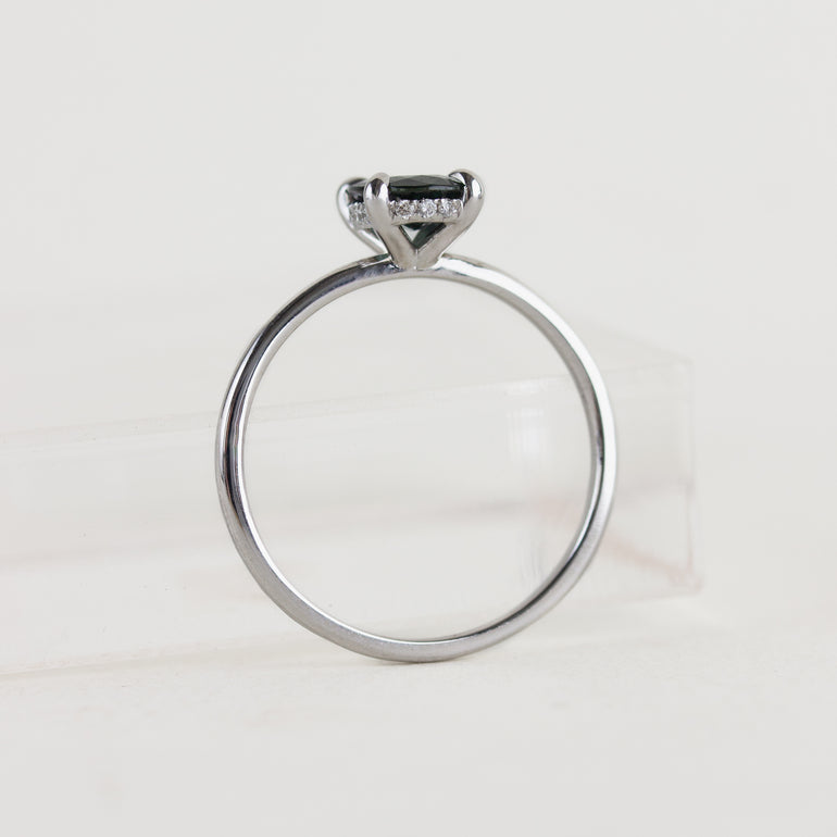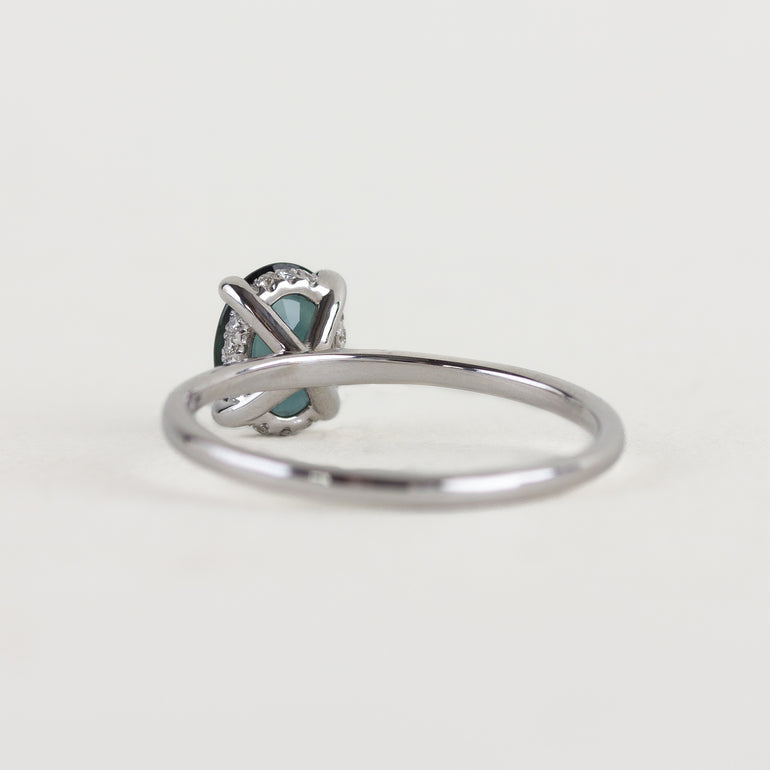 The Avery Ring: featuring a moody 1.11ct dark teal sapphire secured by distinctive eagle claw prongs. A hidden halo of round, brillaint-cut natural diamonds completes this elegant solitaire design.
