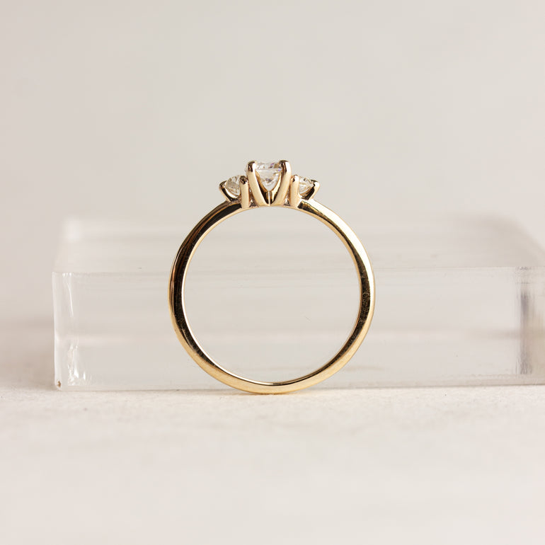 The Bria Ring features an old European-cut natural diamond, flanked by two mine-cut natural diamonds to represent your past, present, and future with your beloved. This petite design is perfect for those with a more minimal, no-fuss style, and dainty eagle claw prongs secure the centre stone for a feminine touch.