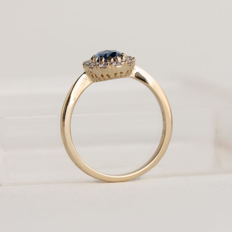 This vintage-inspired beauty is as unique as she is breathtaking. A rose-cut light blue sapphire is surrounded by a halo of twelve brilliant-cut diamonds atop a bold tapered band. The juxtaposition of the two different cuts gives this classic design just the right amount of sparkle.