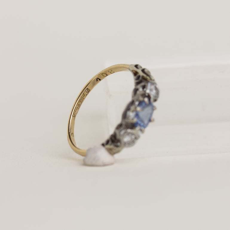 The Riedel Ring: a two-toned platinum and 18K yellow gold ring featuring a beautiful light periwinkle sapphire flanked by round, brilliant-cut diamonds and ornate, geometric details on the shoulders.