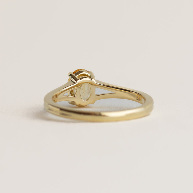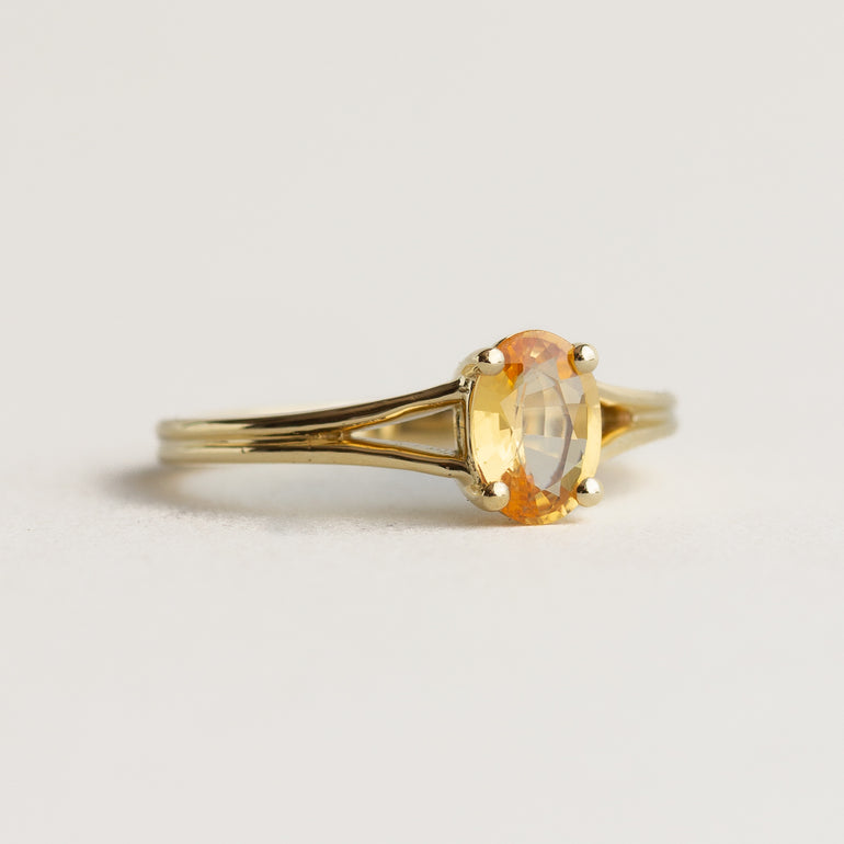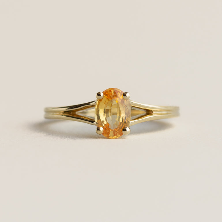 This unique engagement ring features a vibrant yellow sapphire set in 18K yellow gold, and framed by a vintage-inspired split band setting. A unique option for those looking for a little added character to the classic solitaire design.