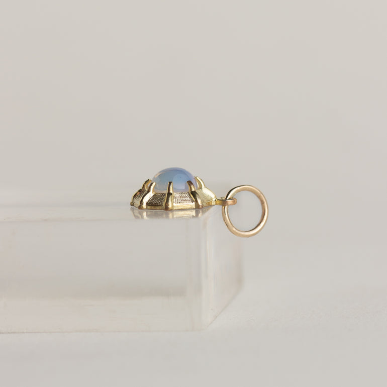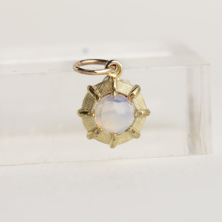 A dainty moonstone charm—crafted in 14K yellow gold. The unique textured finish gives this piece a subtle sheen.