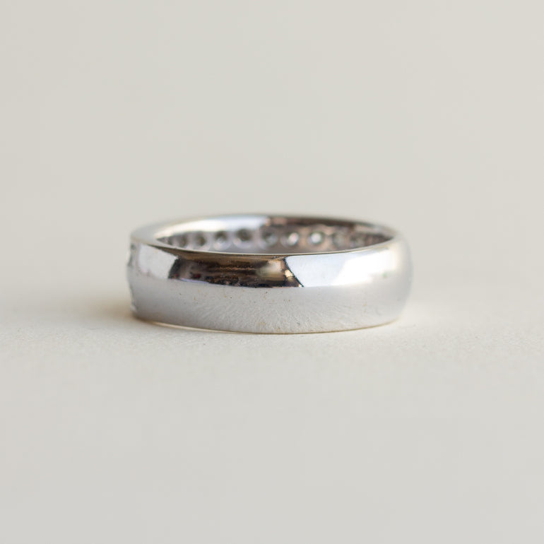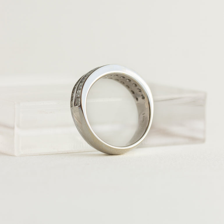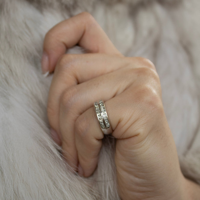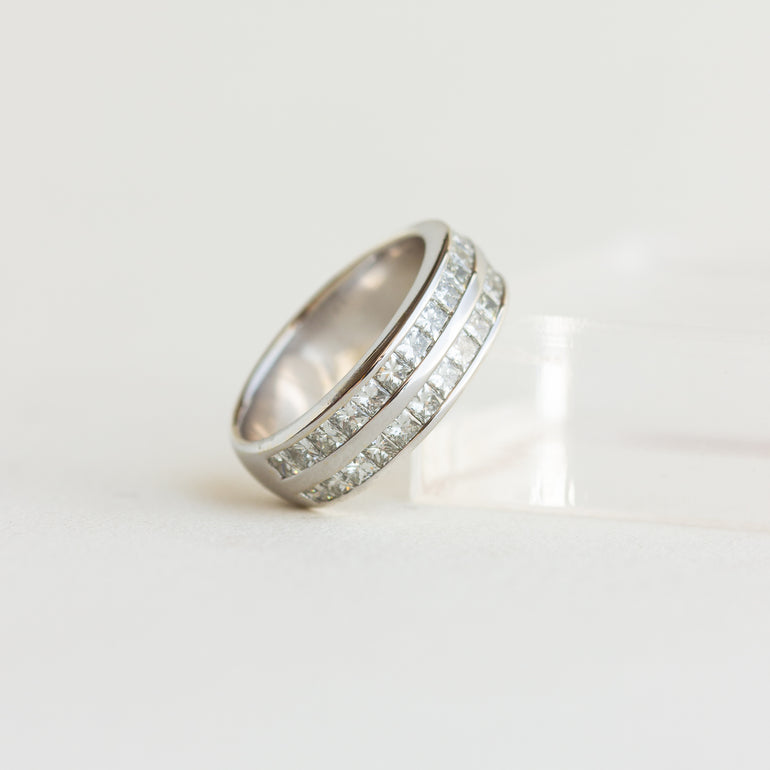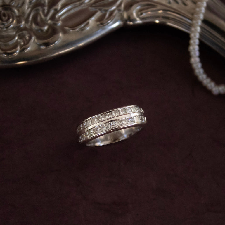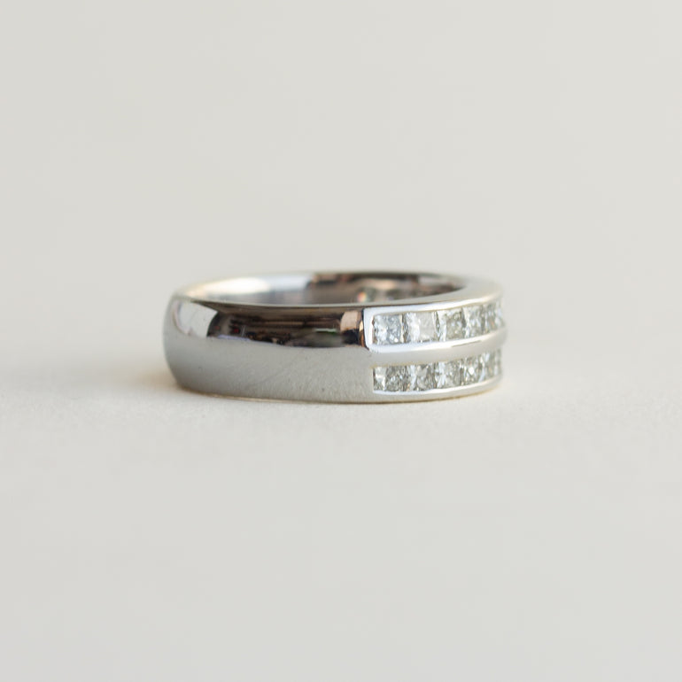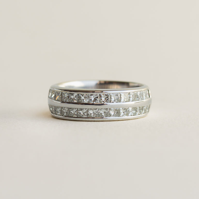 The Brinkley Ring: featuring two rows of glittering channel-set princess-cut natural diamonds set atop a wide 18K white gold band.