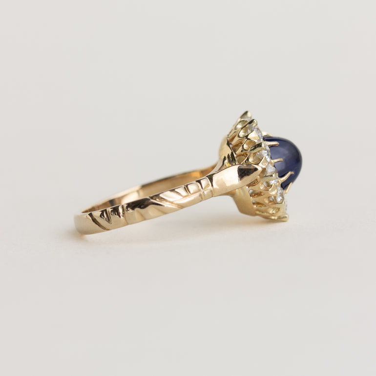 The Gladstone Ring: showcasing a unique 1.81ct sapphire cabochon. The sapphire is held in place by ten claw prongs, and framed by an impressive halo of round, old European-cut natural diamonds. The band features engraved details, cathedral shoulders, and a split-shank.