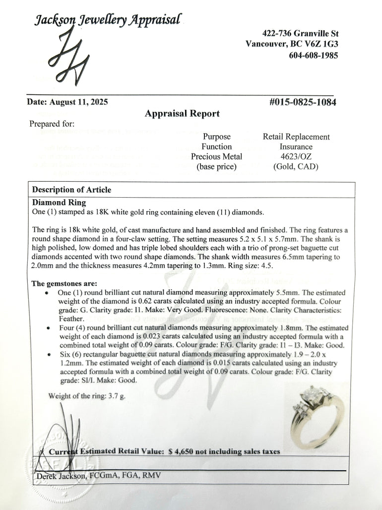The appraisal of the vintage ring is attached as one of the images; there you will find detailed information about the ring, as well as the appraised value of the ring at $4,650 CAD. The appraisal is included with the purchase of the ring to aid in the insurance process if you choose to insure (which you should!)