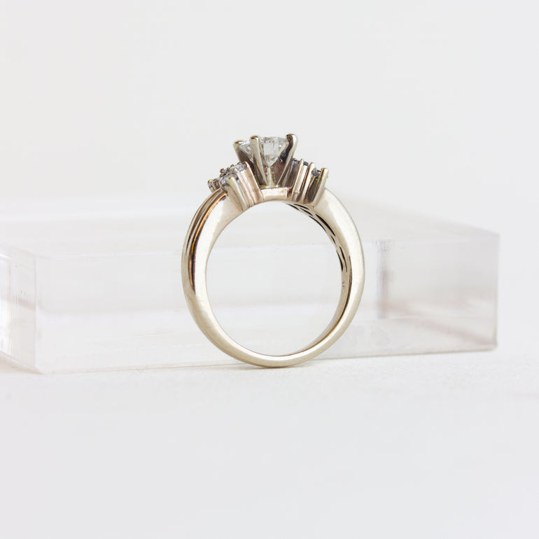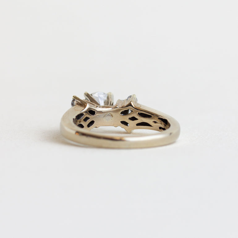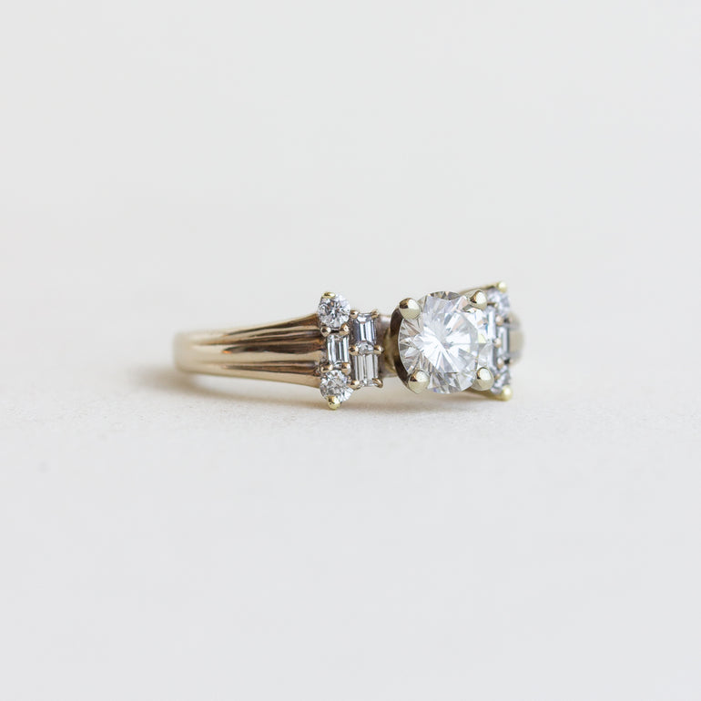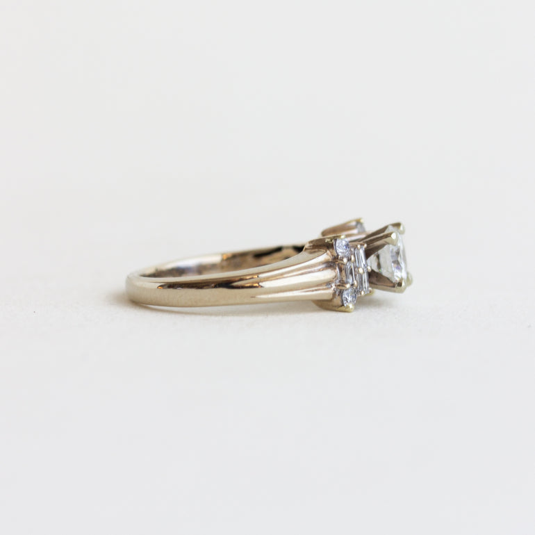 The Janssen Ring: an exceptional 18K white gold vintage engagement ring showcasing a 0.62ct round, brilliant-cut natural diamond as its centrepiece. A geometric cluster of baguette-cut and round diamonds accent this angular yet organic design.