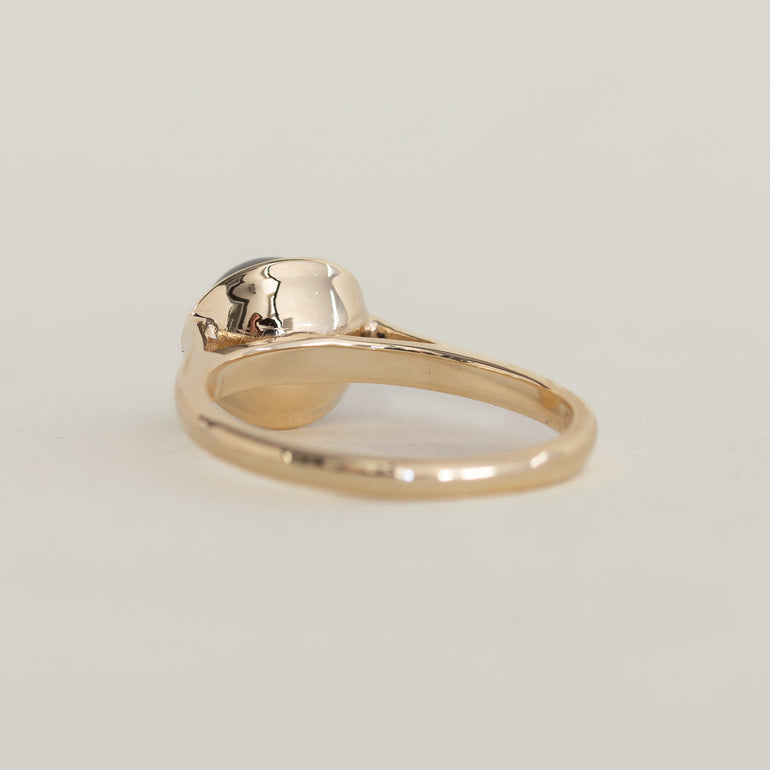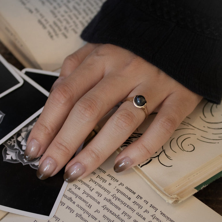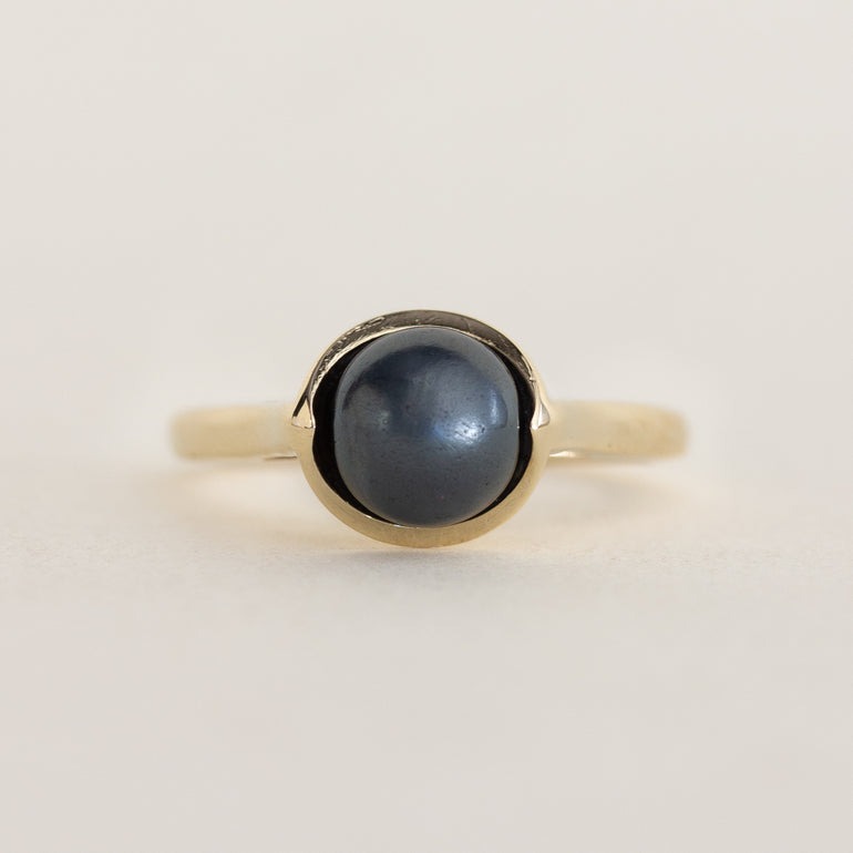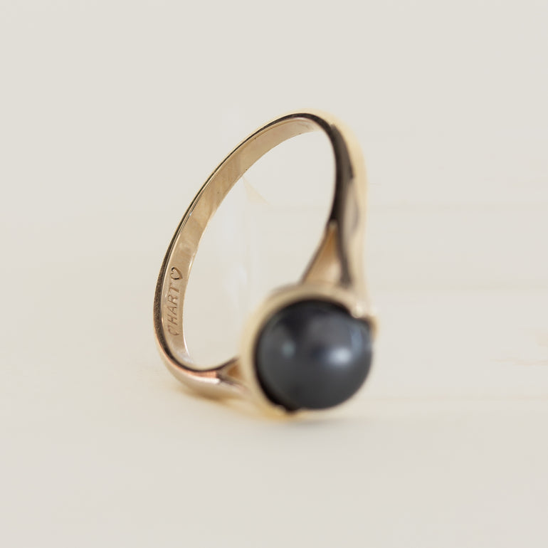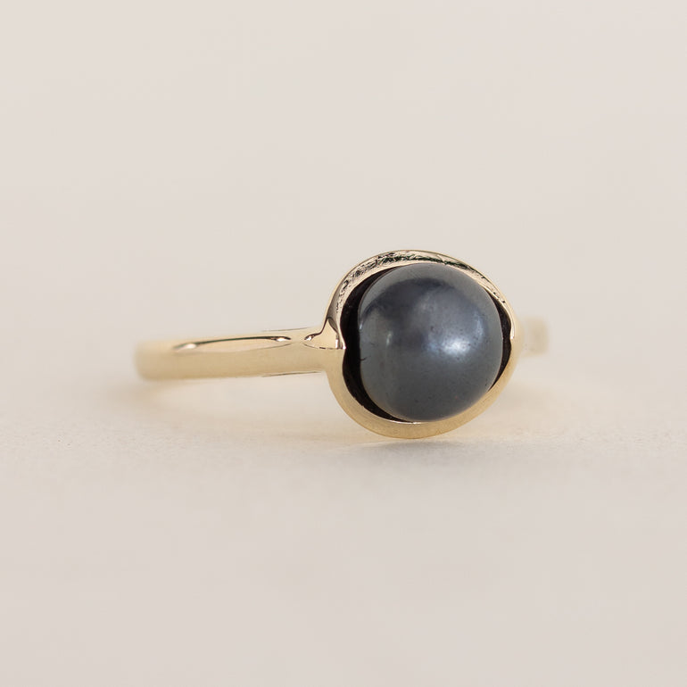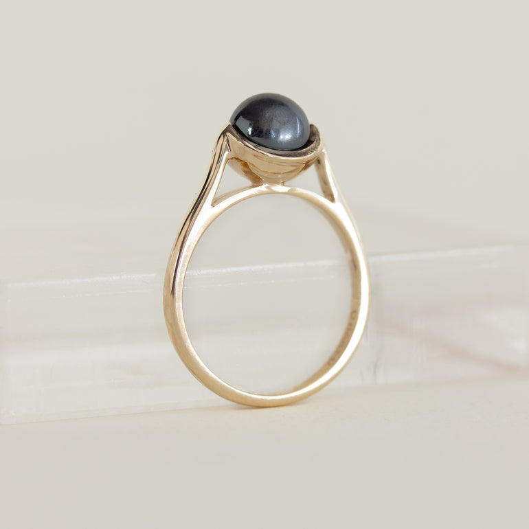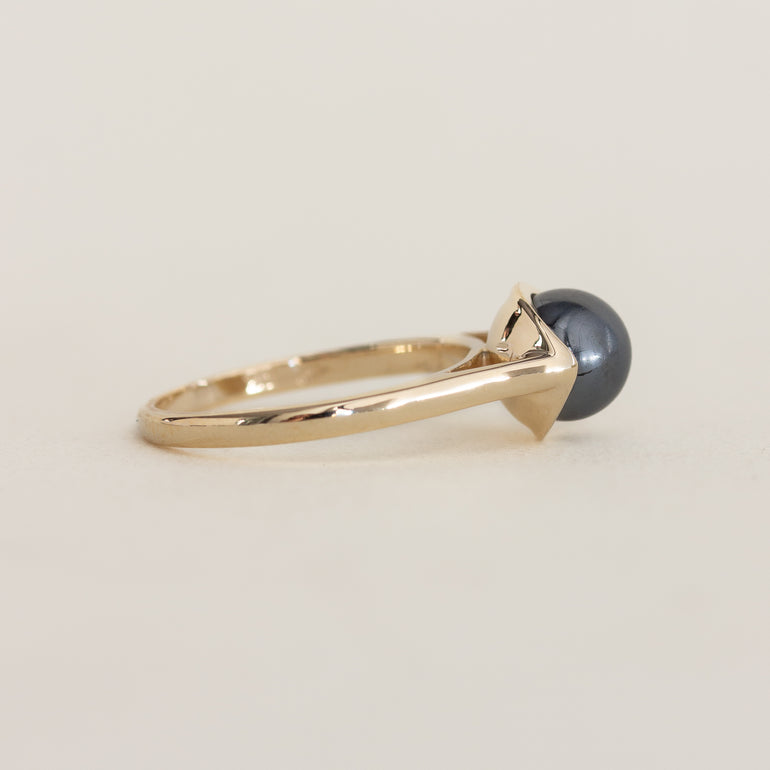 Crafted in 10K yellow gold, the Lamy Ring features a simple, yet unique cup setting, enwrapping a large black pearl as it centrepiece.
