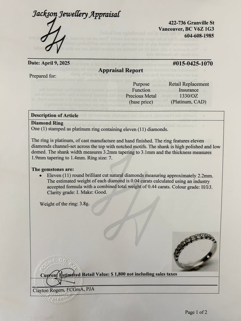 The appraisal of the vintage ring is attached as one of the images; there you will find detailed information about the ring, as well as the appraised value of the ring at $1,800 CAD. The appraisal is included with the purchase of the ring to aid in the insurance process if you choose to insure (which you should!)