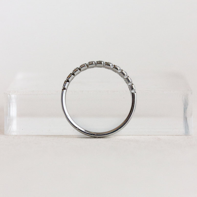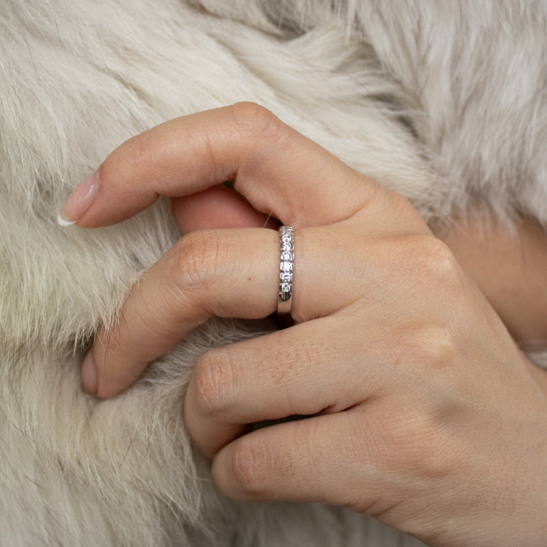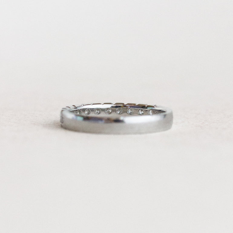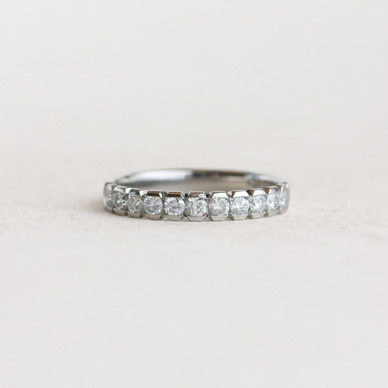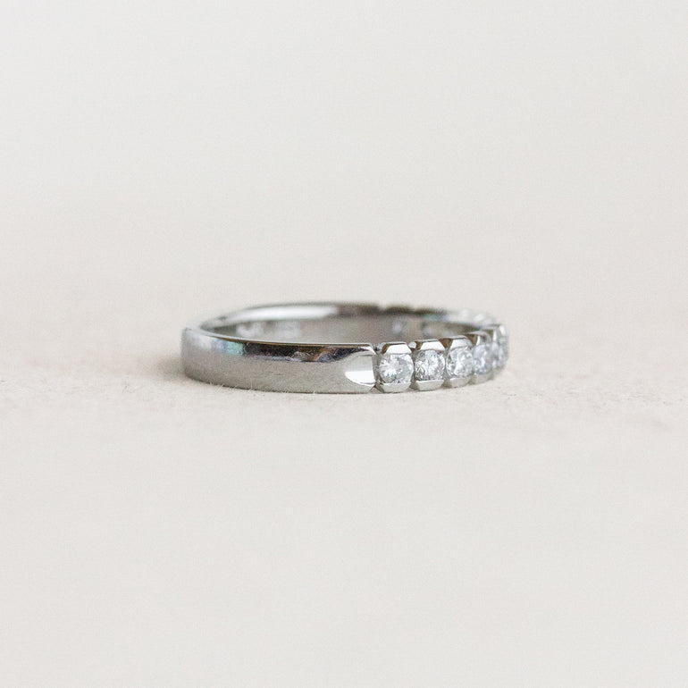 The Mayne Band: a stunning vintage platinum band set with 0.44 TCW of round, brilliant-cut natural diamonds. The channel setting features unique notch motif, giving this otherwise classic design an air of refined craftsmanship.