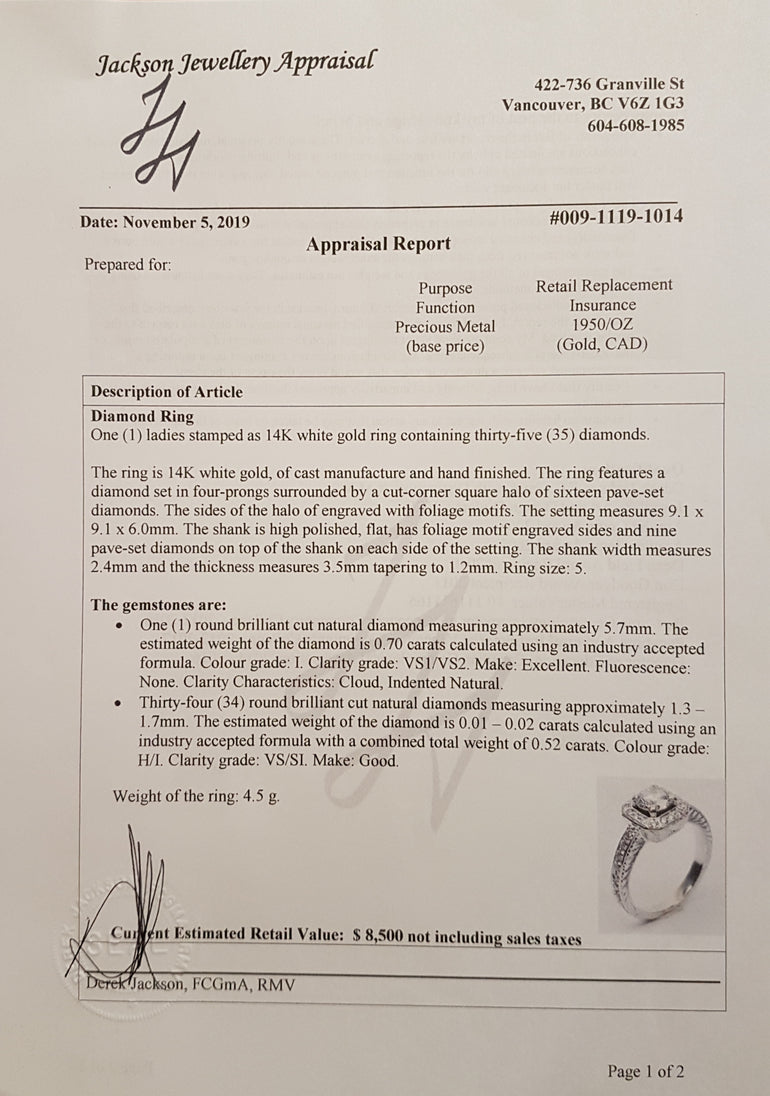 The appraisal of the vintage ring is attached as one of the images; there you will find detailed information about the ring, as well as the appraised value of the ring at $8500 CAD. The appraisal is included with the purchase of the ring to aid in the insurance process if you choose to insure (which you should!).