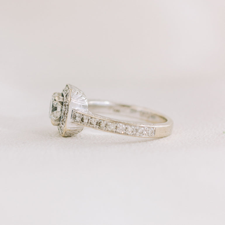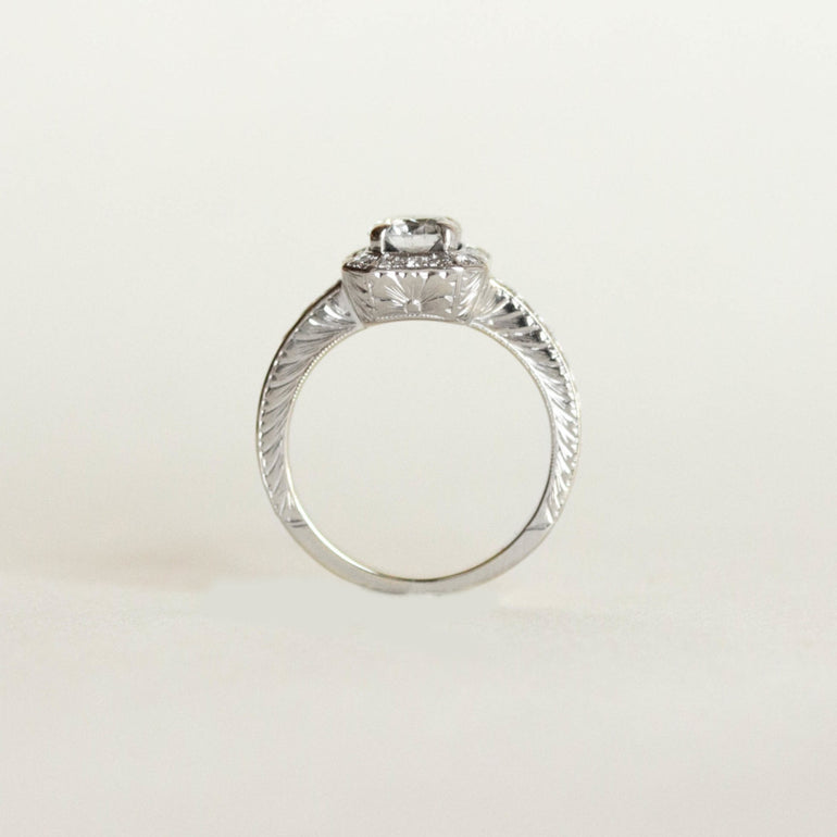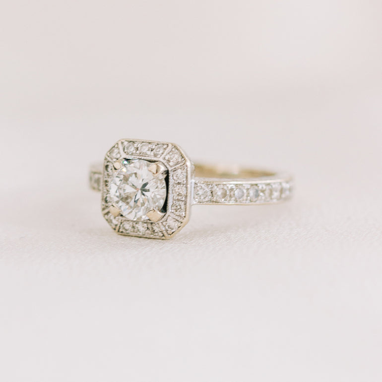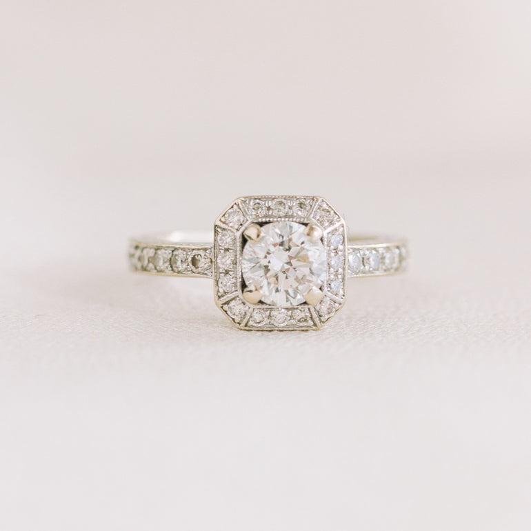 This intricate ring is nothing short of theatrical. A dramatic 0.7 ct centre stone is supported by an art-deco inspired halo. This iconic style has a hidden floral detail under the basket and along the band that gives a nod to age-old romance.