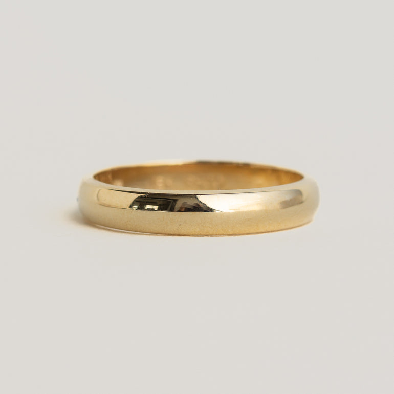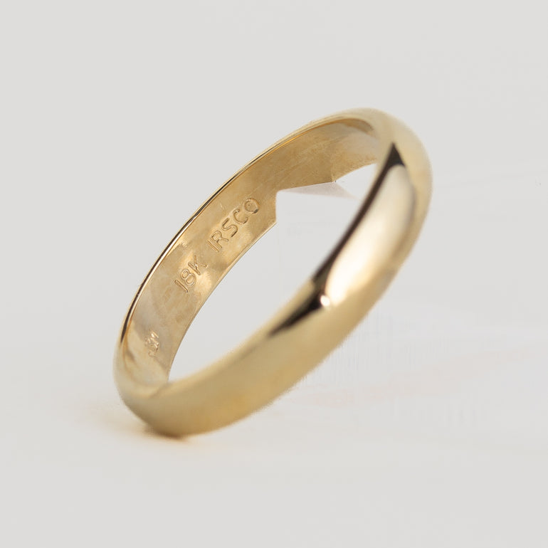The Rowland Band: a classic half round wedding band—crafted from rich, 18K yellow gold.