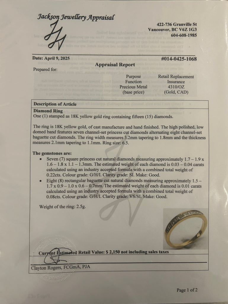 The appraisal of the vintage ring is attached as one of the images; there you will find detailed information about the ring, as well as the appraised value of the ring at $2,150 CAD. The appraisal is included with the purchase of the ring to aid in the insurance process if you choose to insure (which you should!)