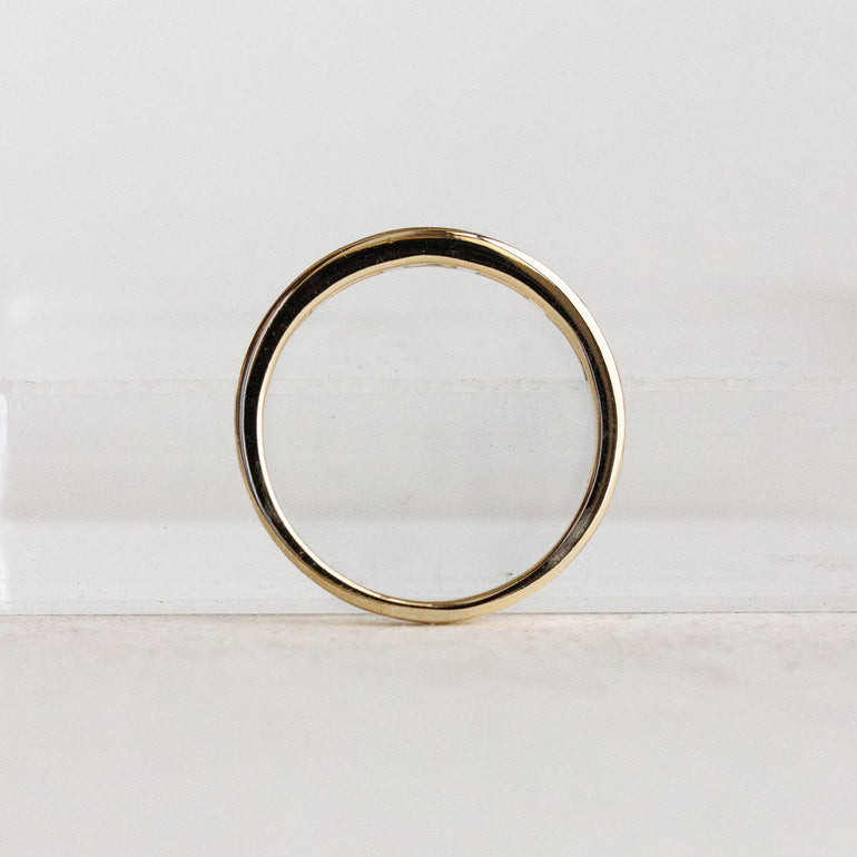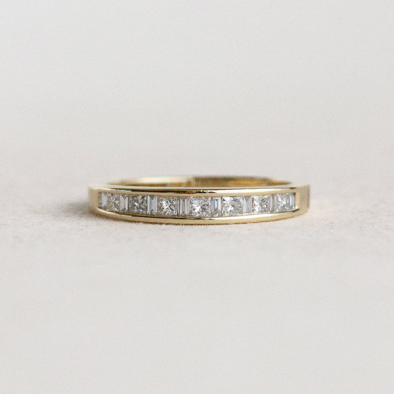 The Santi Band: a stunning array of channel-set princess-cut and baguette-cut natural diamonds. A gentle taper in band width and thickness serves both aesthetic and function—this minimal channel setting is perfect for those who want a no-fuss, comfortable wedding band.
