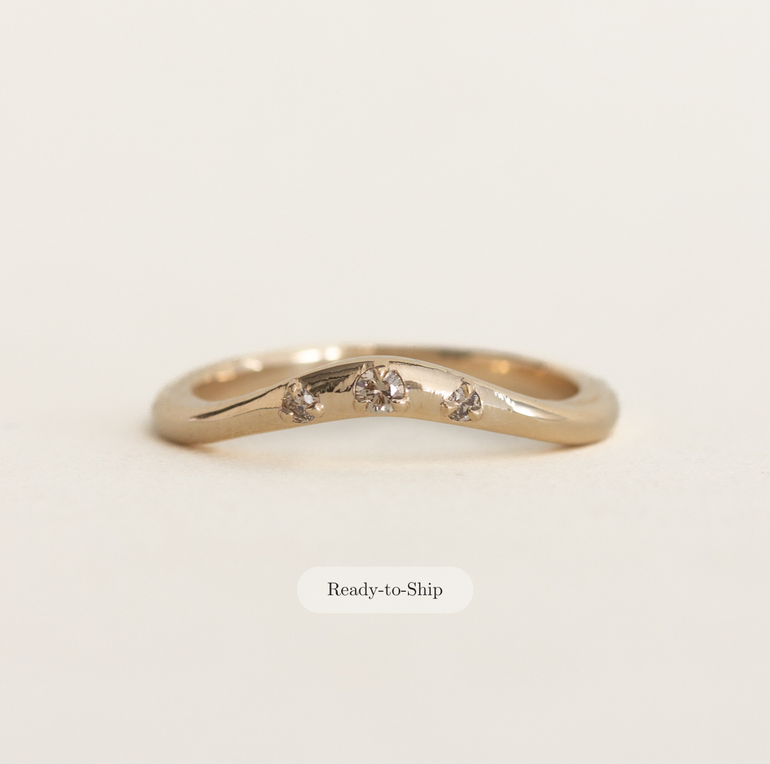 The Lena Band: a classic contour wedding band, design to flow around low-profile engagement ring designs. Three bead-set champagne diamonds contribute a tonal accent this otherwise simple band.