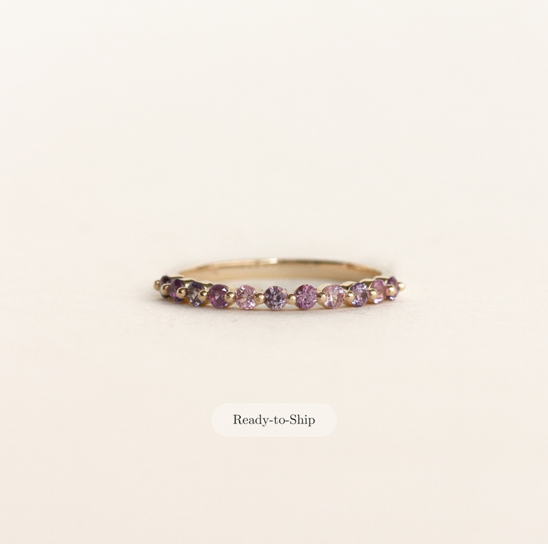 This minimal, modern take on the traditional eternity band is stunning worn alone or alongside an engagement ring. Dainty natural pink sapphires are separated by only one prong, creating the illusion that each stone is floating in place. Each stone has been specially selected and as such this band is a one-of-a-kind!