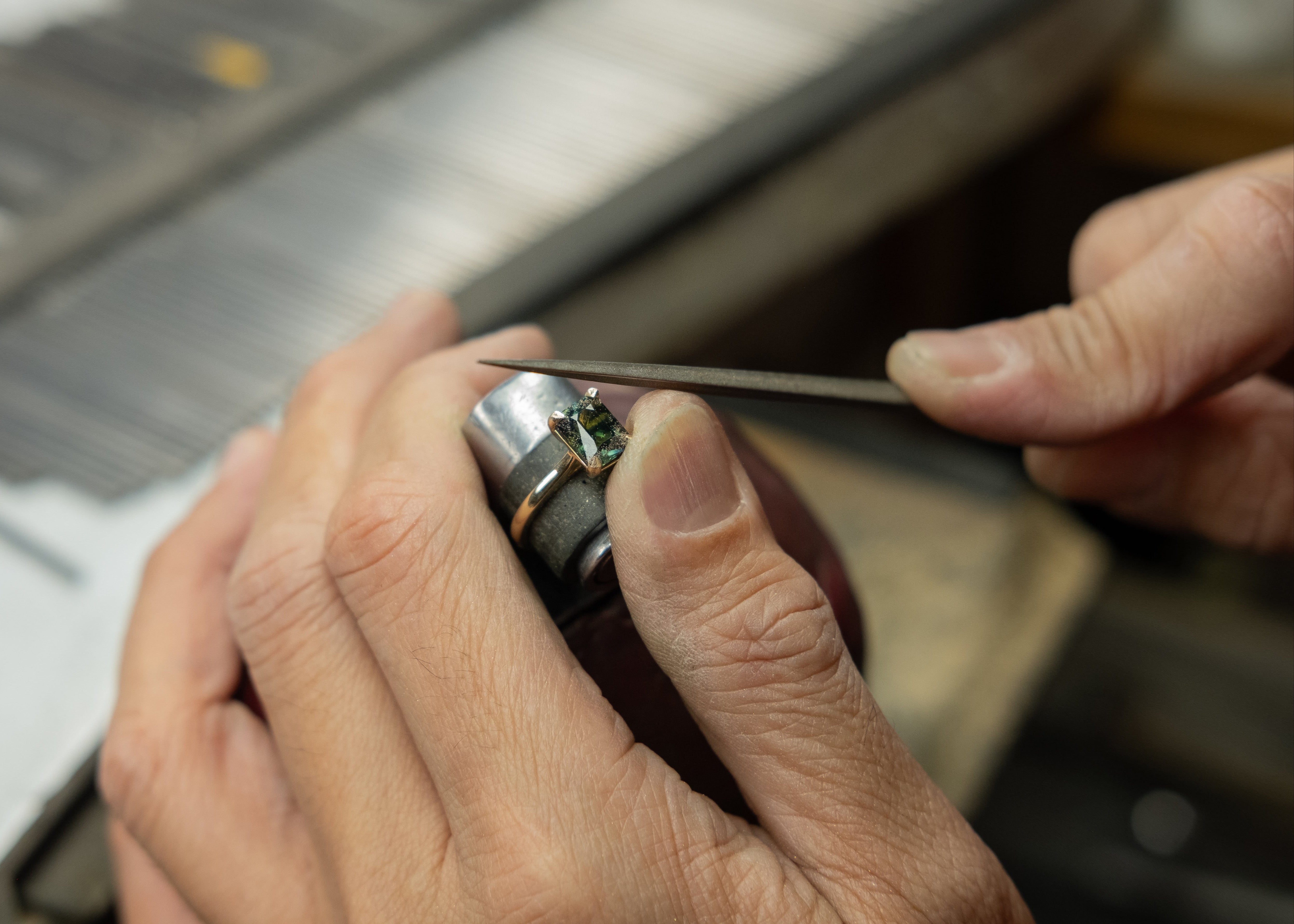 The casted ring then goes through a series of sanding and polishing processes. Next, the stone(s) you selected are set: one by one, carefully, perfectly. The prongs of the casted ring are bent over the stones to hold them securely in place. The ring is polished one last time, cleaned, and thoroughly checked over.