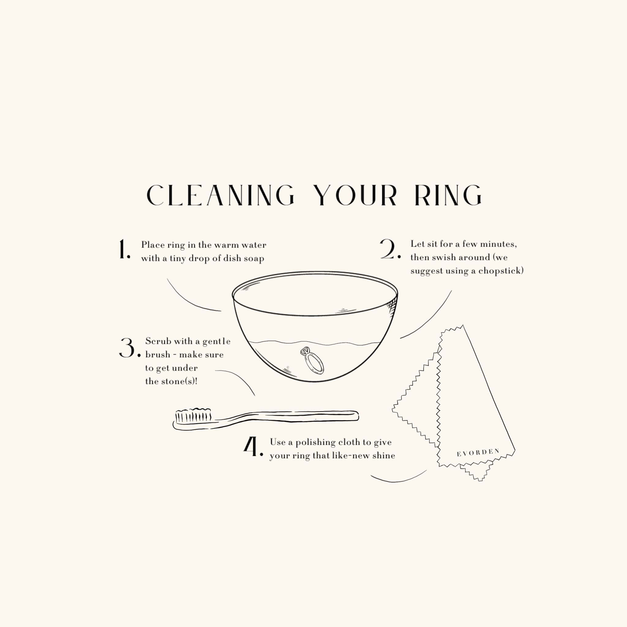 To keep your ring sparkling like new (everyday!), you can clean it regularly from home as well. We recommend giving your jewellery a thorough at-home clean at least once a month. All you have to do is fill up a bowl with hot water, a drop of dish soap, and put your piece(s) in and let them sit for a few minutes. Then, give your jewellery a swirl around (we recommend using a chopstick!). If your pieces have stones in them, take a soft-bristled toothbrush and give the stones a gentle but thorough brush to remove any excess grime.