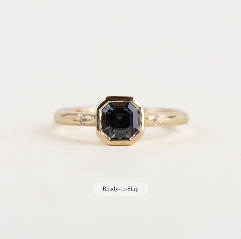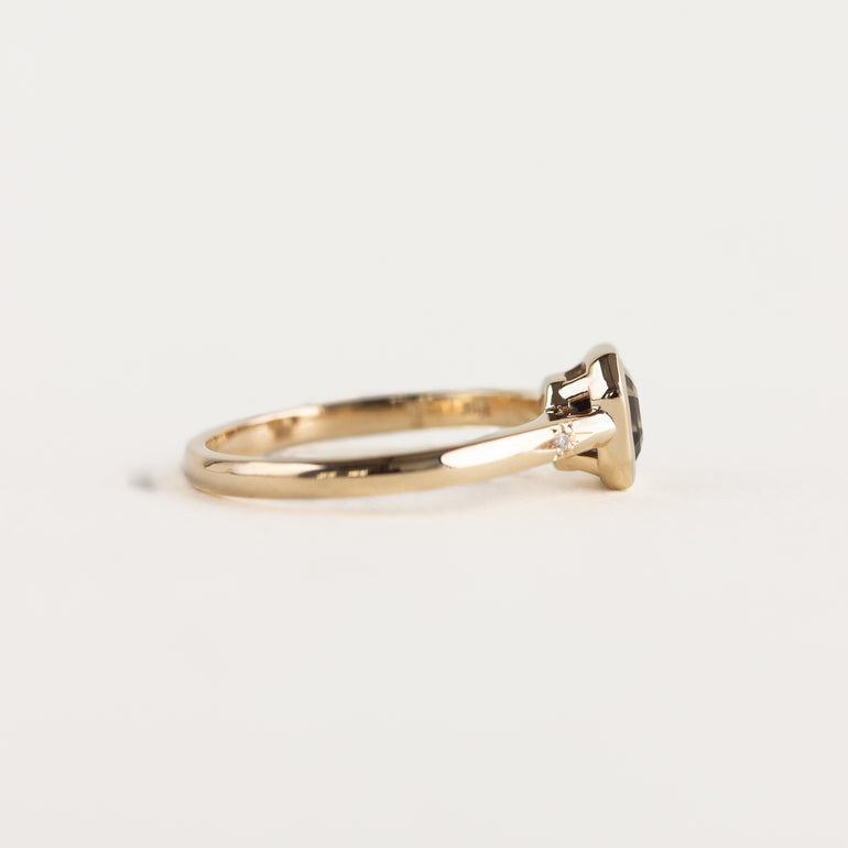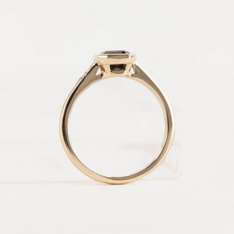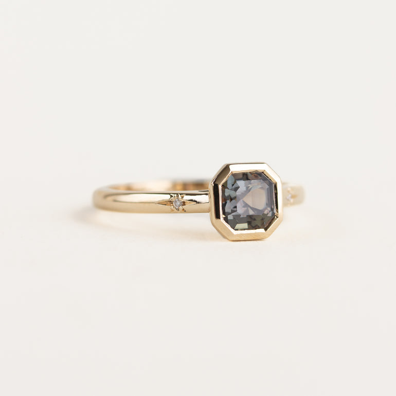 The Abigail Ring: a modern and feminine design featuring a unique bezel-set unheated natural sapphire, flanked by two petite star-set natural diamonds. The centre stone colour shifts from a plum purple colour, to an earthy brown-green.