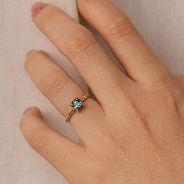 Main image shows a cushion-cut teal sapphire centre stone. For diamonds and colour stones selections, we will follow up with specific stone options once your order is placed.