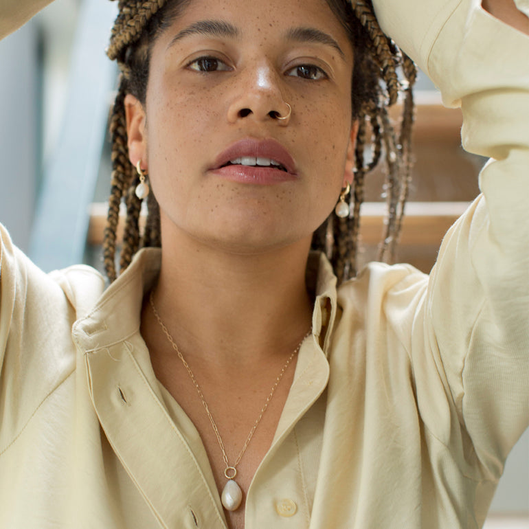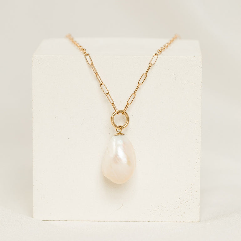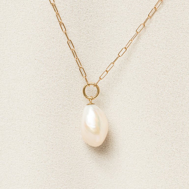 Made of solid 14K gold, this necklace features a baroque pearl suspended from a perfectly rounded bail and modern paperclip chain. The perfect piece, whether dressing up or dressing down—a 14K gold piece that goes everywhere you go.