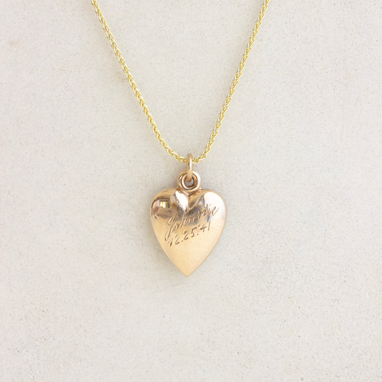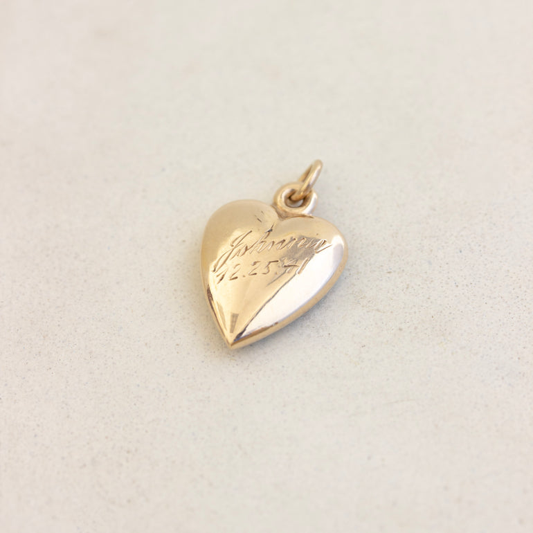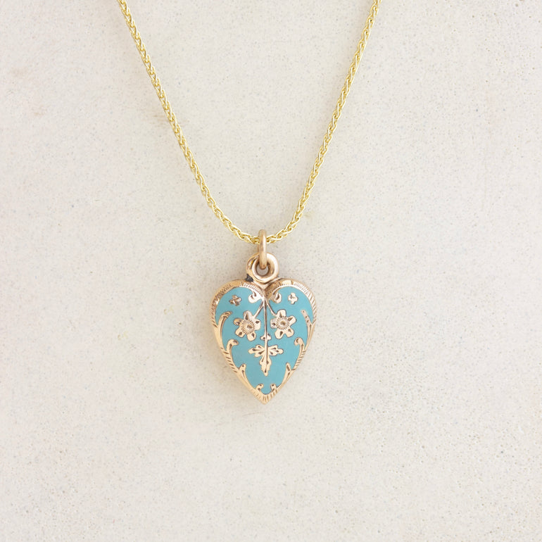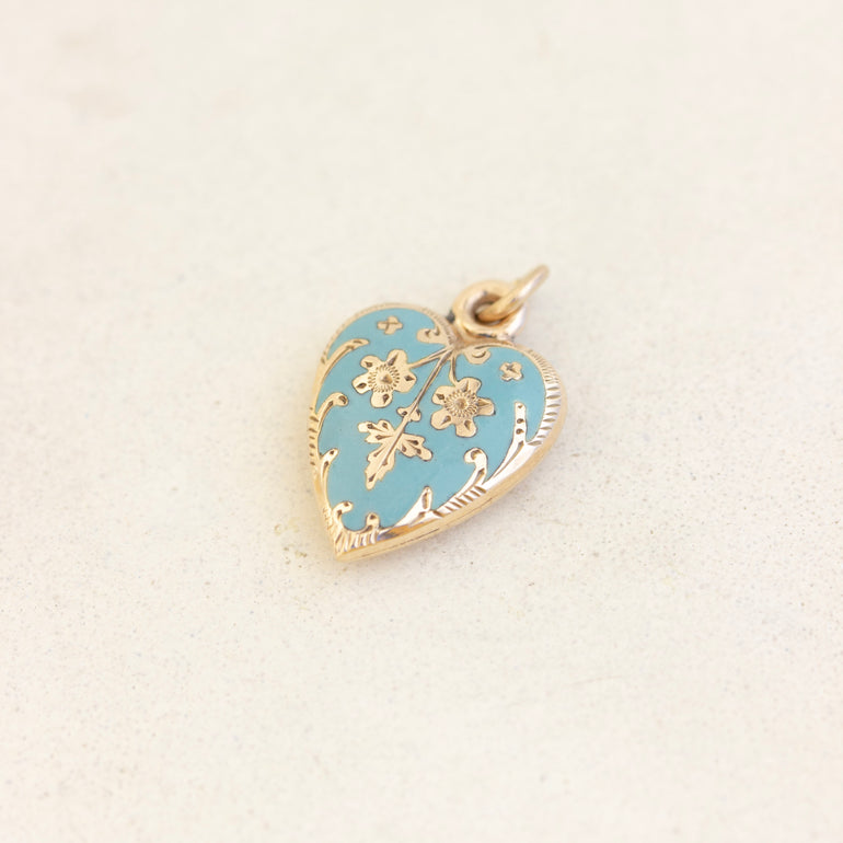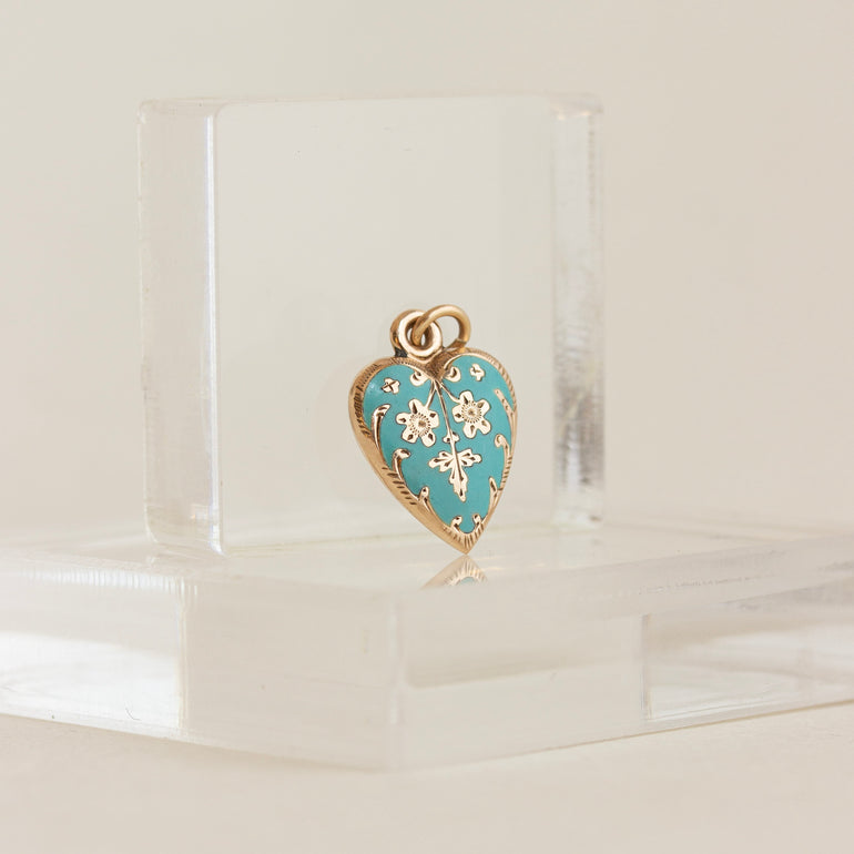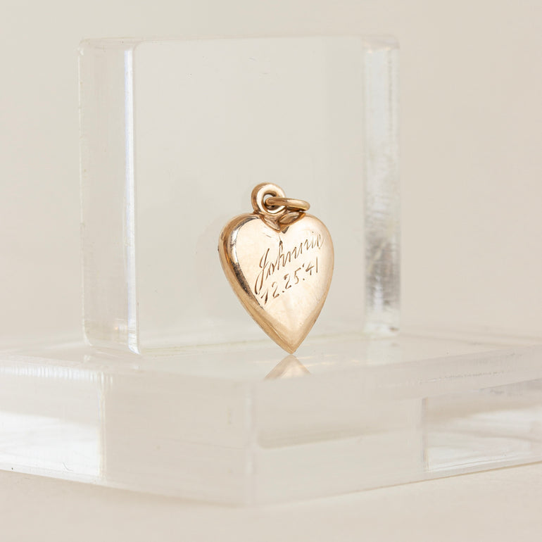 Crafted in rosy 10K yellow gold, the ornate floral engravings and robin egg blue enamel adorn this one-of-a-kind vintage charm. This charm features a heartwarming engraving that reads "Johnnie 12.25.'41".