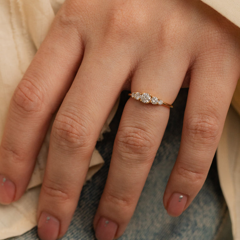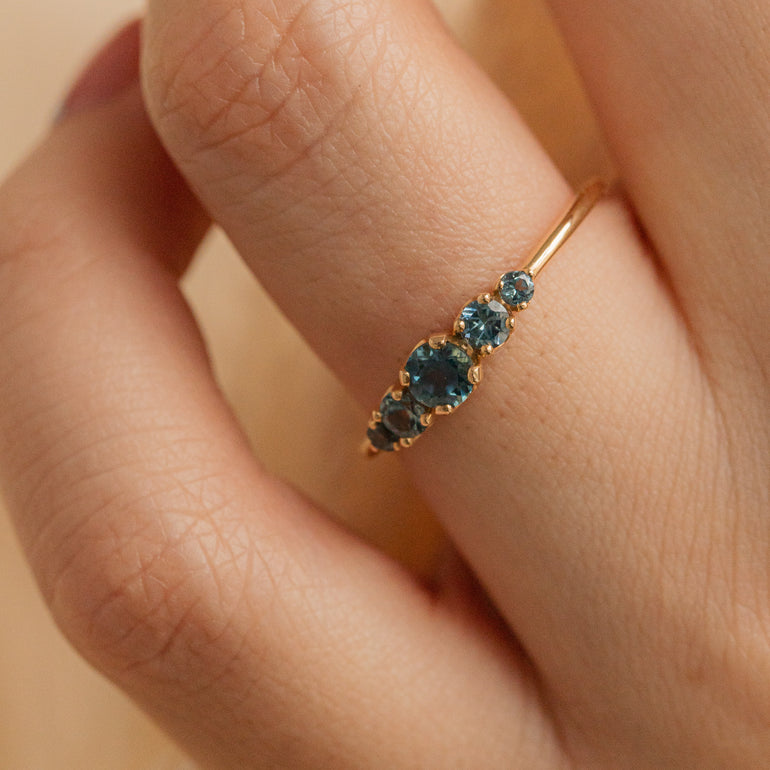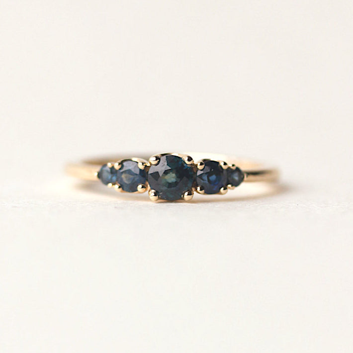 This five-stone ring is vintage-inspired with a modern take. Five blue sapphires range in size from 2mm to 4mm and are mounted on a minimal, tapered band. Unique and sophisticated, this stunning design is perfect for the fiancée with timeless, yet daring, style.
