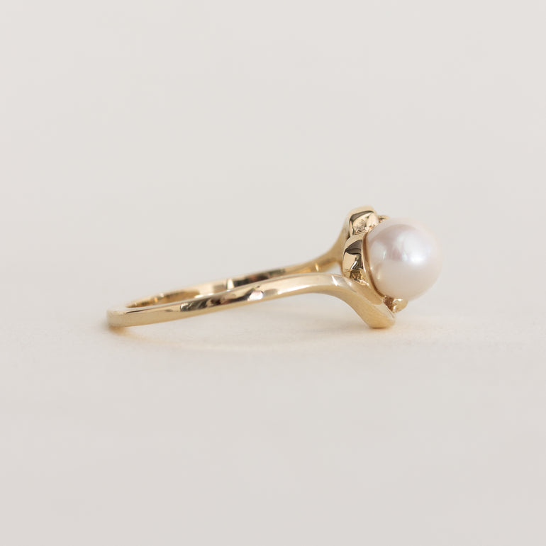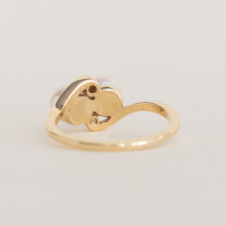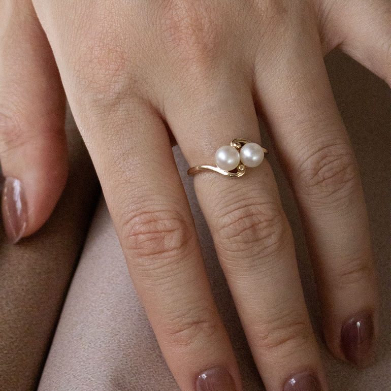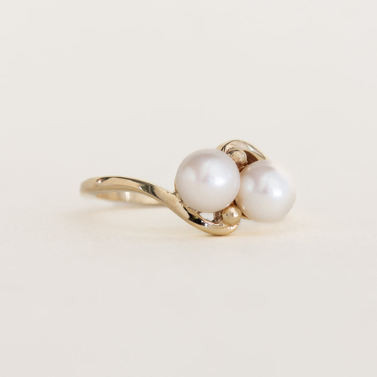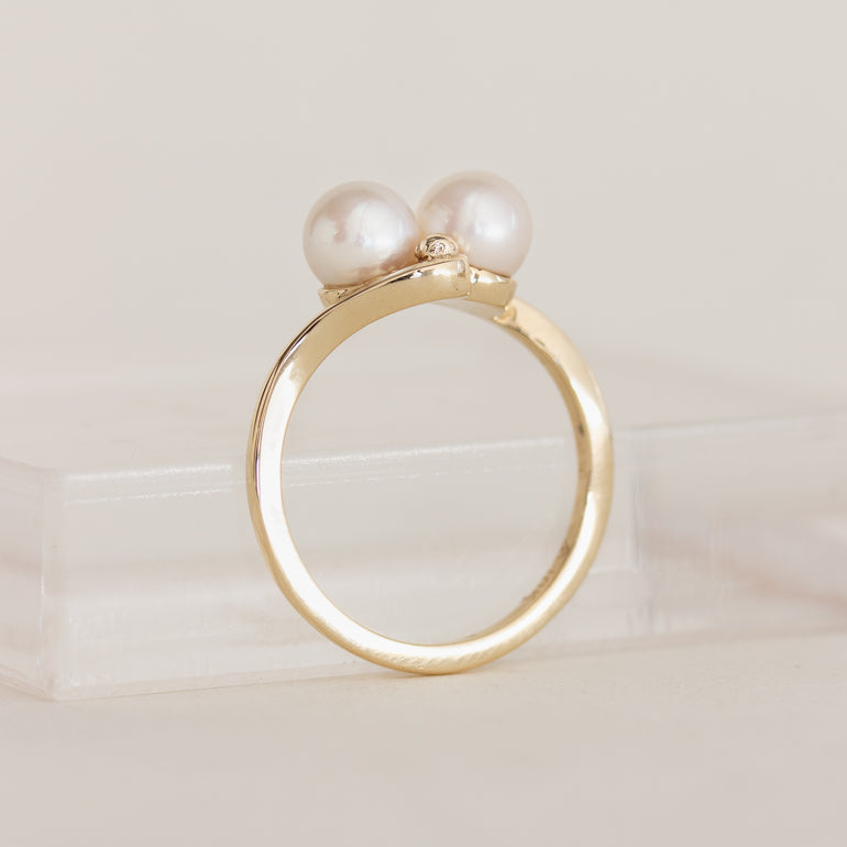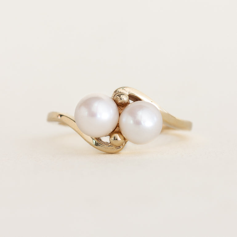 The Lotus Ring features twin pearls; each with a lovely display of iridescence and an exceptional lustre. The 10K yellow gold bypass design leads into a subtle gold bead details which compliment the round pearls.