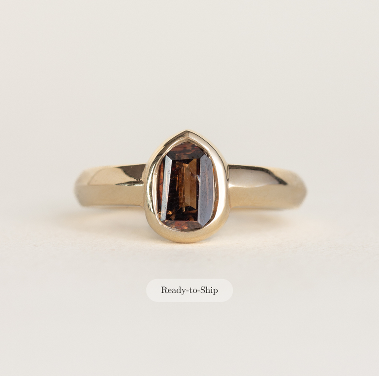 The Remi Ring effortlessly balances architectural geometry with easygoing style—featuring a bold shield, step-cut fancy brown natural diamond at it's centre. A bubbly bezel setting transitions seamlessly into a refined knife-edge band.