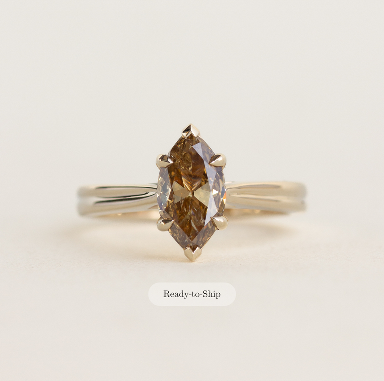 The Sylvie Ring: a classic solitaire design featuring a deeply saturated 1.18ct marquise, brilliant-cut champagne diamond. Fishtail prongs are a stylish and protective choice, ensuring the centre diamond is safe and secure. The otherwise simple band features concave shoulders, providing a subtle and feminine bow-like detail.