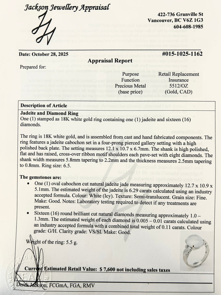 The appraisal of the vintage ring is attached as one of the images; there you will find detailed information about the ring, as well as the appraised value of the ring at $7,600 CAD. The appraisal is included with the purchase of the ring to aid in the insurance process if you choose to insure (which you should!)