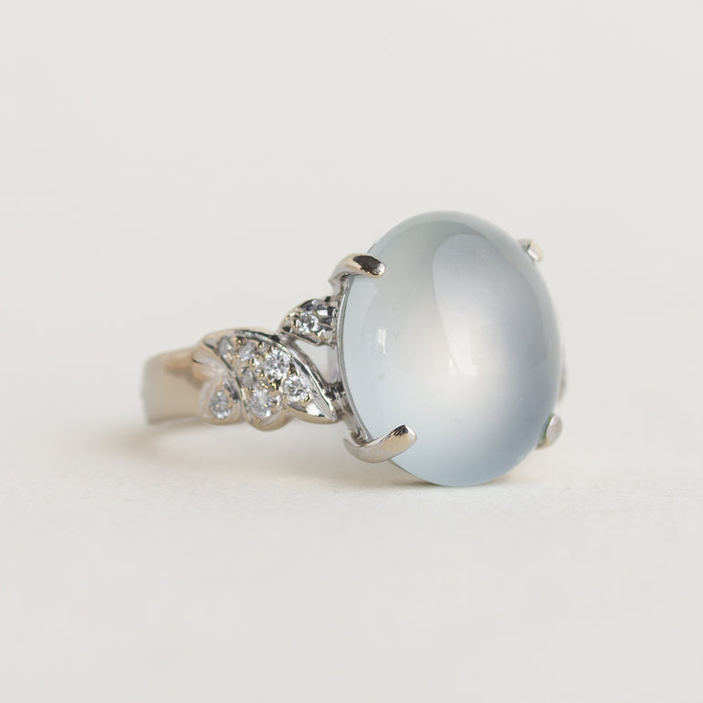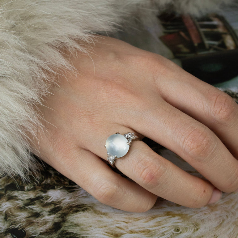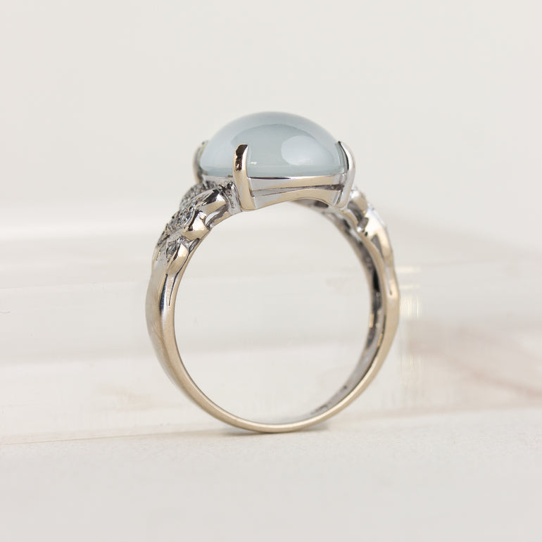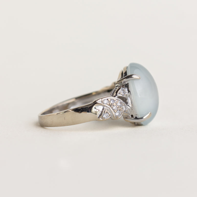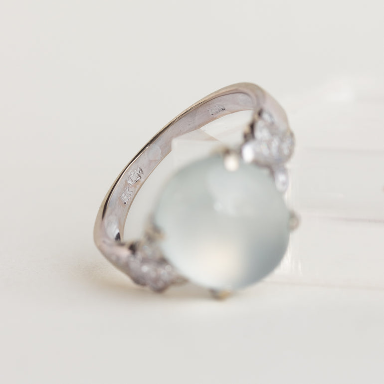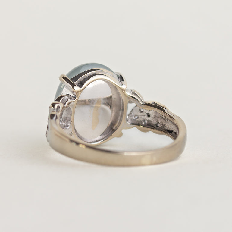 The Wentworth Ring: set in 18K white gold, an ethereal 6.29ct 'Ice Jade' jadeite cabochon produces a captivating luminosity. The band features a ribbon motif accented with ropes of pavé diamonds.
