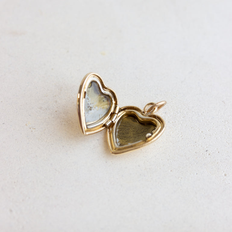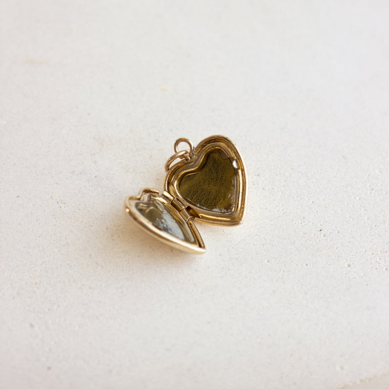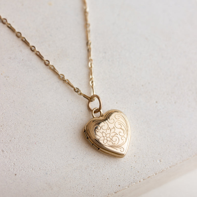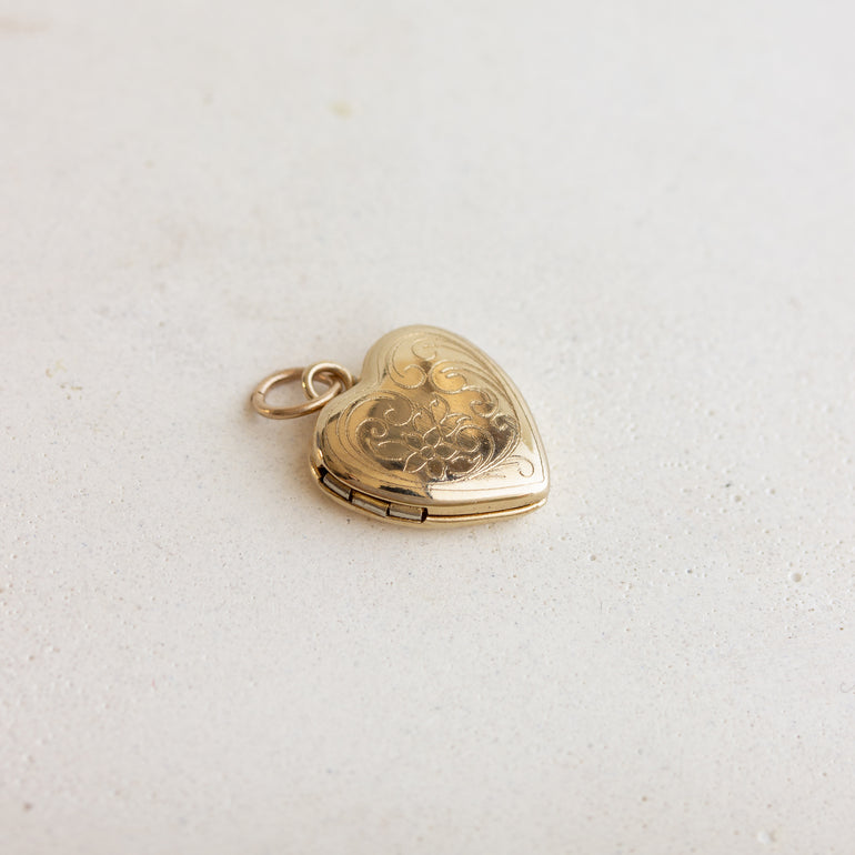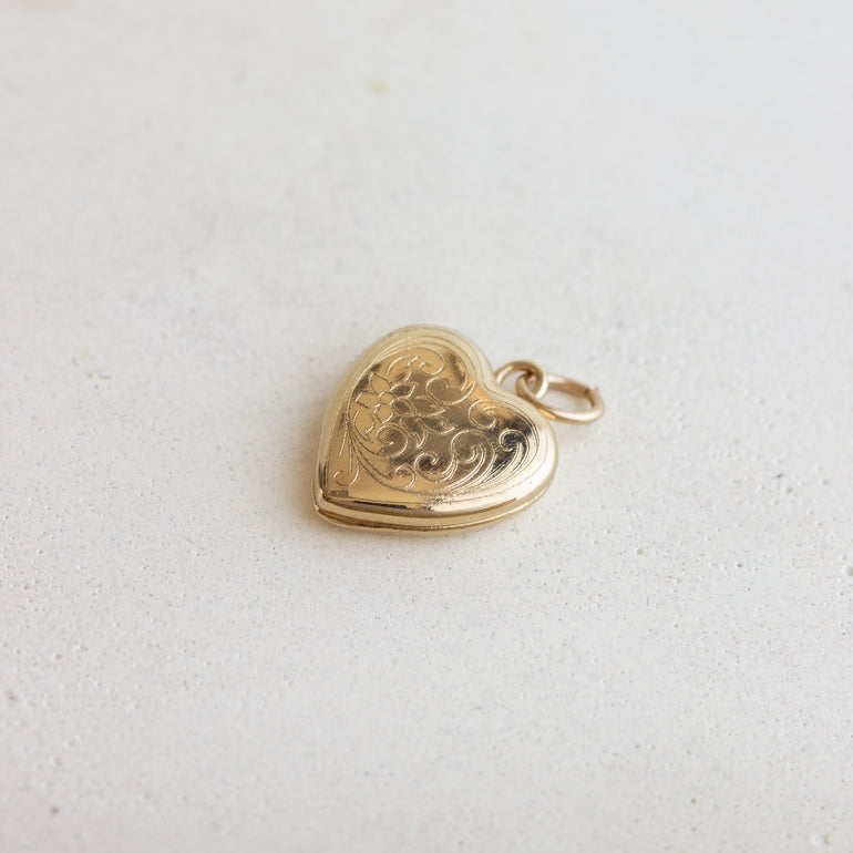 A beautiful vintage heart locket, made in 14K yellow gold. A floral motif and swirling engravings adorn the front.